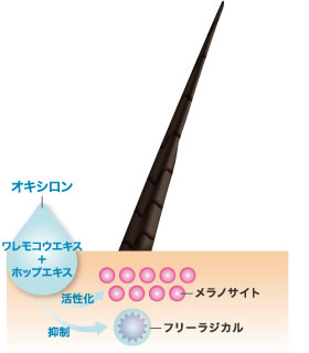 オキシロンには、育毛効果・抗炎症効果のあるワレモコウエキスとメラノサイトを活性化するホップエキスが入っており、この2つを組み合わせることで、フリーラジカルを抑制します。これにより白髪の進行の抑制ができます。